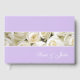 Este libro de firmas se muestra en Lavanda con un bonito panel de acento de rosas blancas florales.