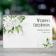 Un sencillo y elegante libro de bodas con rosas blancas color agua y flores del aliento del bebé sobre un fondo blanco.