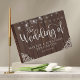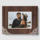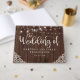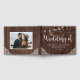 Rustic Wood String ilumina el Boda de encaje Photo Guest Book con un fondo rústico de madera con cuerdas brillantes de luces y encaje de estilo vintage en las esquinas inferiores. Añade tu foto y detalles para un libro de visitas hermoso y romántico.