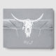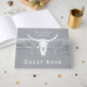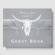 Rústica temática gris claro calavera de toro blanco país boda de recepción de vaquero occidental libro de invitados keepsake. Casa de campo de estilo vintage inspirada en texturas estampadas angustiadas. Antiguo estilo salvaje del oeste. Guay, diseño moderno y de moda para animales de granja. Personaliza tu guión. Derechos de imagen de Marg Seregelyi Photography.