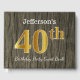 El diseño de este libro de huéspedes incluye el número ordinal "40" con un aspecto de oro falso. También tiene un nombre personalizado y un estilo rústico de madera falsa. Se podría usar en un fiesta para alguien que celebre su 40º cumpleaños. [~Z0000053]