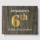El diseño de este libro de huéspedes incluye el número ordinal "6º" con un aspecto falso dorado. También cuenta con un nombre personalizado y un ambiente rústico de madera falsa. Se podría usar en un fiesta para alguien que celebre su sexto cumpleaños. [~Z0000053]