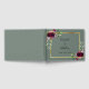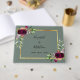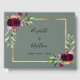 Un moderno y elegante libro de huéspedes decorado con rosas de color agua en burdeos con plumas y vegetación. Con un marco de oro falso. Fondo verde de sabio. Plantillas para sus nombres y fecha de boda. Los nombres de la parte delantera están escritos con una escritura de estilo moderno y moderno con letras a mano. Letras de color negro. Añade tu texto en la columna vertebral. Texto negro Atrás: fondo verde sabio.