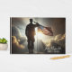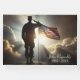 Una silueta de un soldado saludando a una bandera estadounidense con una dramática puesta de sol en el fondo de un funeral o servicio conmemorativo.