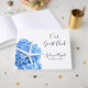 libro de bodas con diseño de hortensias azules y estrellas del mar / estrellas de mar. Este libro blanco, que forma parte de la suite Seaside Garden, cuenta con fuentes de escritura manuscritas modernas para el título y los nombres de la pareja. Incluya también la fecha del evento en texto impreso. Diseño limpio, sencillo y elegante para una pareja que se casa cerca del mar.
