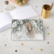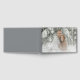 This wedding guest book cover features a serene winter scene with two individuals standing closely in a snowy forest, surrounded by snow-covered trees. The color palette is dominated by cool whites and grays, contrasted with the warm tones of their clothing, creating a harmonious blend that enhances the wintery feel. The design uses elegant serif typography for customizable names and dates at the bottom center, adding a classic touch to the romantic theme. The overall mood is intimate and tranquil, perfect for celebrating an engagement or wedding in a picturesque setting.