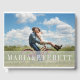 Invite a los huéspedes de su boda a compartir sus deseos y sabiduría con este libro de moda, que incluye su foto favorita de compromiso o instantánea en el frente. Sus nombres aparecen en letras blancas modernas en la parte inferior de una franja superpuesta. Termine el aspecto con un texto de columna personalizado y una foto de sangrado completa adicional en la tapa posterior.