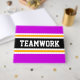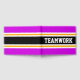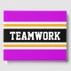 Este colorido y deportivo diseño presenta un texto atlético TEAMWORK dentro de una amplia franja de carreras horizontal en el centro, de color negro, con rayas brillantes, de color amarillo dorado y blanco, contra rayas de borde exterior de color rosa brillante. Los colores y el texto de este diseño se pueden personalizar.