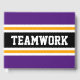 Este colorido y deportivo diseño presenta un texto atlético TEAMWORK dentro de una amplia franja de carreras horizontal en el centro negro con franjas de borde exterior reales de color amarillo y blanco brillantes, con franjas de borde amarillo y violeta. Los colores y el texto de este diseño se pueden personalizar.