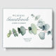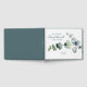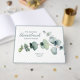 Este libro de invitados muestra sus nombres e información de bodas en un tipo de letra serif moderno con elementos de script. La tipografía está enmarcada por una sola rama de eucalipto.