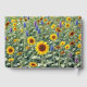 A vibrant field filled with bright yellow sunflowers and a mix of purple and blue flowers stretches into the distance for a funeral or memorial service,