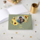 Con un tema de girasol con delicados acentos de Relieve metalizado dorado y fuentes de escritura sobre un fondo de Sage Green. Personaliza tu foto favorita para un conservador especial especial para tu boda.