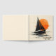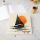Un velero navega por las estilizadas olas con un llamativo sol naranja al fondo para un funeral o un servicio conmemorativo. Se puede cambiar el texto.