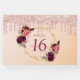 Un libro de invitados para una dulce fiesta de 16 y 16 años. Un fondo de degradado dorado y rosa ruidoso de moda con un marco geométrico falso dorado. Decorado con flores moradas oscuras y borgoñonas, rosas y plumas de estilo boho. Rosa purpurina de imitación de oro gotea, pinta goteo en la parte delantera y trasera. Plantillas para un nombre, edad 16 y fecha. Fecha de nacimiento o fecha del fiesta. El nombre está escrito con un guión de estilo con letras a mano, letras de color rosa, 16 años en morado y la fecha con números negros. Añade tu texto en la columna vertebral.