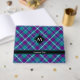 Decoración de color verde marino, morado y azul tartán. Patrón sin foco. texto personalizado y monograma.
