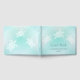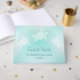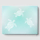 This lake house guest book feature a coastal design in soft colors, white turtles on a soft shiny turquoise background.