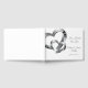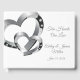 This wedding guest book is shown in a white color with a two hearts one love theme print shown with silver tone hearts with crystals and has silver colored text.