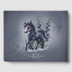 Unicornio estilizado en esplendor floral. Esta obra de arte representa un unicornio estilizado con piel gris oscura y un cuerno de plata. Rosas morados adornan el cuello y la cabeza, creando un aura elegante y prestigiosa. Grandes ojos de color violeta expresivo y una sonrisa suave le dan un toque agradable e inspirador. El fondo, con flores azules oscuras estilizadas y tallos verdes, crea un ambiente de ensueño y florido.