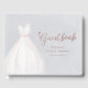 Libro de invitados de regadera de boda elegante con vestido de novia blanco de acuarela con brillo falso libro de invitados de escritura dorada rosa en fondo azul polvoriento.