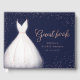 Libro de invitados de la fiesta de despedida de soltera elegante con vestido de novia de acuarela blanca con brillo libro de invitados de escritura con lentejuelas de rosa de oro falso sobre fondo azul marino.