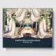 Las cortinas blancas, con un suave tapiz de teatro, están recubiertas de una bonita flor floral blanca, y las velas están colocadas en la base. Las cortinas forman un cuadro en torno a una acuarela de una larga mesa rectangular de madera con sillas, un mantel blanco y una bonita vajilla y cubiertos. Encima de la mesa hay lámparas de araña de bonito y arcos de piedra, y a ambos lados de la mesa de comedor al aire libre hay más asientos. Este elegante diseño es ideal para un país, boho, toscano, italiano, viñedos o boda íntimo e informal, y se adapta a los restaurantes, restaurantes y restaurantes de alto nivel.