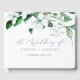 Este libro de bodas con monograma de vegetación de bosques es perfecto para una boda de verano o otoño. El moderno diseño de boho cuenta con exuberantes hojas de color esmeralda, salvia y verde oliva y productos botánicos con estampados de elegantes flores blancas. Personalice la portada con los nombres de la novia y del novio y la fecha del boda.