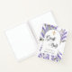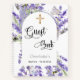 Un elegante fondo blanco decorado con un armazón de flores de lavanda violeta y una cruz dorada. Personalice y agregue un nombre y un título/evento. El Libro de invitados está escrito con un elegante guión marcado a mano.