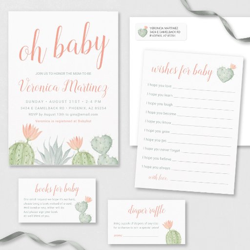 Bonita tarjeta de alojamiento Books For Baby con temática desértica. Hágale saber a los clientes que están solicitando un libro en lugar de una tarjeta. El ilustracion de cactus acuático es delicado, en tonos rosas y verdes. Coincide perfectamente con la Invitación Baby Shower de Oh Baby Cactus en esta colección. Perfecto para un boho o una moderna ducha de bebé al suroeste. Seleccione el botón "Personalizar" para añadir su propia redacción.