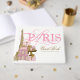 Libro de invitados de fiesta de cumpleaños de París con Torre Eiffel dorada y regalos rosados y dorados y mesa con par de zapatos de tacón alto con brillo dorado. Este libro de invitados de París se personaliza fácilmente para su evento simplemente agregando los detalles de su elección. También puede agregar un color de fondo a este elegante libro de invitados de fiesta de cumpleaños y evento de París.