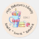 Pegatinas circulares para llevar un registro de los libros de la biblioteca de tu aula. Cuenta con un ilustracion acuarela de una taza azul , un par de libros , una manzana roja y flores blancas esparcidas por ahí . Personalízalos con el nombre del profesor y el número de la habitación . © ArianeC Ilustraciones-Todos los derechos reservados
