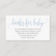 Una tarjeta de gabinete Books For Baby bonita y sencilla. Hágale saber a los invitados que están solicitando libros en lugar de tarjetas. Esta tarjeta de gabinete tiene letras polvorientas azules y coincide perfectamente con la invitación de Baby Bash en esta colección. Para añadir una redacción diferente, basta con seleccionar el botón "Personalizar" de la derecha.