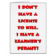 Un texto gracioso que seguramente pondrá una sonrisa en la cara de todos. El texto dice: No tengo licencia para matar. ¡Tengo un permiso de estudiante!