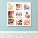 Un regalo de cumpleaños número 80 único, celebrando su vida con un collage de 8 de sus fotos. Añada imágenes de su familia, amigos, mascotas, pasatiempos o destino de viaje de ensueño. Personalice y agregue un nombre, edad 80 y fecha. Letras de color gris y negro. Un fondo dorado de color rosa femenino y carnoso de moda. Este lienzo también está disponible en nuestra tienda con fondo de color blanco o negro.