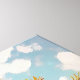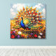 Peacock wall art. A pretty illustration of a peacock with beautiful gold and blue feathers standing in a field of purple, red and white flowers.