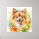 Acuarela de un perro pomchi (Pomerania/Chihuahua) con piel roja, bronceada y blanca y orejas puntiagudas sonriendo en un campo de flores.