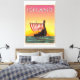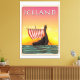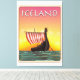 Afiche de Viking Travel de Islandia, con un barco largo en el océano durante la puesta de sol.