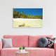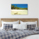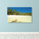 Agua de mar cristalina en una playa tropical con arena dorada y palmeras al borde del cielo azul