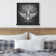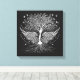 Juego de alas metálicas de plata, árbol y raíces que simbolizan las alas para volar con detalles de aves, corazones y flores sobre un fondo negro. La ilustración incluye la frase: "Dé a los que amas las alas para volar, raíces para volver y razones para quedarse. Ella vuela sobre sus propias alas. Con raíces en el amor, ella florece". Lienzo