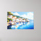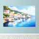 Un exquisito cuadro de aceite que representa un tranquilo pueblo costero mediterráneo. El escenario muestra edificios encalados con cálidos tejados naranjas de terracota, enclavados entre árboles verdes y arbustos. Más abajo, aguas tranquilas y azules reflejan el pintoresco entorno, con pequeños barcos de pesca amarrados suavemente, lo que añade encanto al tranquilo puerto. El cielo está adornado con nubes blancas y mullidas, iluminadas por la luz del sol, mientras que las gaviotas se elevan con gracia por encima. Las audaces pinceladas texturadas y la rica paleta de tonos azules, blancos y tierra dan vida al ambiente animado y sereno, evocando la esencia de un tranquilo refugio costero.