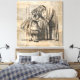 Un diseño de arte vintage de Alicia en el País de las Maravillas con un ilustracion de Alicia en el País de las Maravillas, de estilo antiguo, donde Alicia tira la cortina.