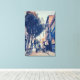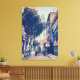 Una estrecha callejuela urbana está rodeada de altos edificios a ambos lados, con un gran árbol dominando el primer plano. La calle está pavimentada con hormigón de color claro y cuenta con una pequeña cafetería con mesas y sillas instaladas en el exterior. Los edificios combinan ladrillo y hormigón con una estética anticuada y vintage.
