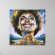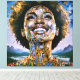 "Alma dorada, cielos infinitos". Una mujer afromoderna radiante rodeada de detalles dorados y cósmicos simboliza fuerza y trascendencia espiritual. Mezclando elementos abstractos y surrealistas, esta pieza exuda inspiración y positividad, con la sonrisa de la mujer representando esperanza, y fuerza interior para un mañana más brillante y unido.