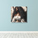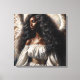 El arte de las lonas presenta un hermoso ángel de mujer negra de piel oscura con grandes alas, usando un vestido blanco con cinturón dorado. Ella tiene el pelo grueso, largo, ondulado, y está mirando hacia el costado. Un retrato radiante de pintura al óleo de un ángel-núcleo de melanina, de Dee Claire.