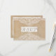 Esta hermosa tarjeta de respuesta para boda tiene el estilo de una lona vintage y desgastada. Sobre la "lona" hay un atractivo y delicado patrón de encaje floral color marfil o crema pálido. En el centro hay un panel hecho para parecer un trozo de papel pergamino con bordes desgarrados para resaltar el texto: RSVP. El reverso de la tarjeta también tiene el diseño de "lona" y "papel". El ambiente general de esta impresionante tarjeta de respuesta es a la vez elegante y rústico. Otras versiones y artículos coordinados están disponibles. Por favor, use los enlaces "enviar mensaje" o "contacto" si necesita ayuda para personalizar cualquiera de nuestros productos.