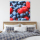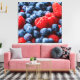 Este diseño presenta una imagen de primer plano de frambuesas y arándanos, que son frutos sanos. Las frambuesas son rojas y las arándanas, como su nombre indica, azules.