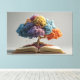 Un majestuoso árbol brota de las páginas abiertas de un libro antiguo, su tronco se eleva hacia una impresionante copa de nubes esponjosas y tonos de joyas en zafiro, amatista, magenta, coral, amarillo dorado, verde menta y rosa suave. Partículas brillantes flotan hacia abajo como polvo encantado, mezclando la magia de la narración con una imaginación vívida y una creatividad sin límites. Perfecto para rincones de lectura, habitaciones de niños, oficinas en casa, bibliotecas, guarderías, estudios creativos, o como regalos inspiradores para amantes de los libros, maestros, escritores, soñadores, padres, o cualquier persona que crea que las historias hacen crecer mundos.