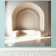 A minimalist tunnel of repeating arches leading to a raised platform with sculptural round seats. The monochromatic palette and precise symmetry create a calm, modern presence.