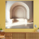 Ein minimalistischer Tunnel aus wiederholten Rundbögen, der zu einer erhöhten Plattform mit skulpturalen runden Sitzen führt. Die monochrome Farbwelt und die präzise Symmetrie erzeugen eine ruhige, moderne Präsenz.