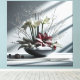 A quiet winter composition with architectural clarity: three white amaryllis rise from a shallow black vessel, accompanied by a red poinsettia bloom, frosted branches, and delicate white buds. Light and shadow play across the wall behind, adding depth and structure to the scene. The monochrome base, accented with touches of red, creates a calm and elegant atmosphere—perfect for interiors seeking both clarity and seasonal presence.