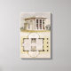 Ilustración arquitectónica vintage con imagen de una casa griega con pilastras o columnas griegas y una planta de blueprint que incluye las habitaciones interiores de la zona de recepción, comedor, biblioteca y dormitorios.